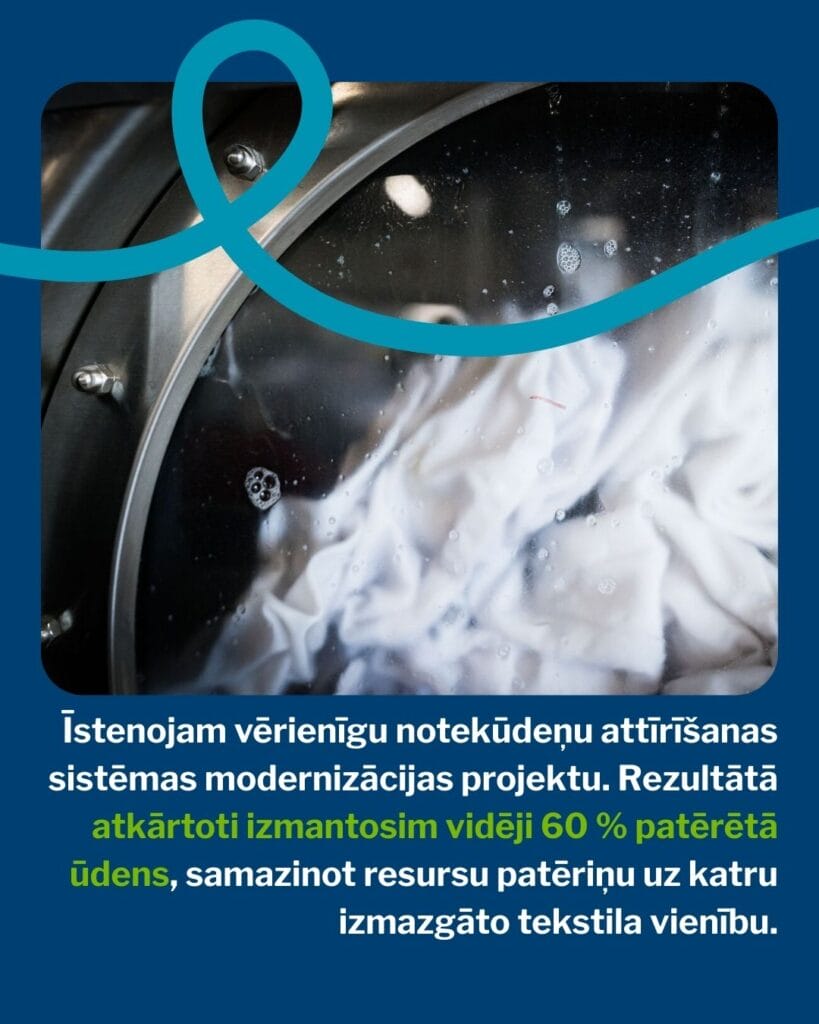 Lai šo solījumu īstenotu praksē, šogad turpinām mērķtiecīgi uzlabot energoefektivitāti, mazināt siltumnīcefekta gāzu emisijas un veicināt efektīvu notekūdeņu attīrīšanu. Viens no nozīmīgākajiem ieguldījumiem šajā virzienā ir notekūdeņu attīrīšanas sistēmas modernizācijas projekts, kura mērķis ir ievērojami samazināt ūdens patēriņu, atkārtoti izmantojot vidēji 60 % patērētā ūdens, kā arī atslogot Babītes pagasta Piņķu notekūdeņu attīrīšanas sistēmu, nodrošinot tīrāku notekūdeņu nodošanu. Projekta rezultātā ievērojami samazināsim resursu patēriņu uz katru izmazgāto tekstila vienību. Vienlaikus, lai veicinātu iekšējo procesu pilnveidi, turpinām īstenot LEAN un 5S iniciatīvas, kas vērstas uz procesu standartizēšanu un efektīvāku ikdienas darba organizāciju.