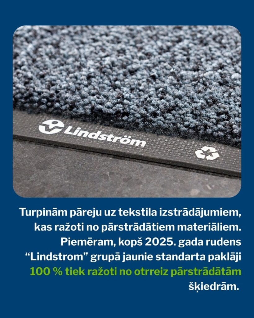 Būtisks virziens, strādājot saskaņā ar aprites ekonomikas principiem, ir pāreja uz tekstila izstrādājumiem, kas ražoti no pārstrādātiem materiāliem. Kā spilgts piemērs ir paklāju serviss – kopš aizvadītā gada rudens “Lindstrom” grupā jaunie standarta paklāji 100 % tiek ražoti no otrreiz pārstrādātām šķiedrām.