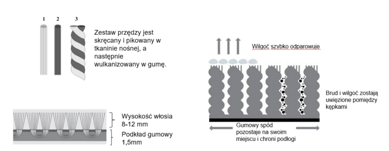 Maty są wykonane ze skręconych włókien nylonowych na podłożu z kauczuku nitrylowego. Ta konstrukcja zapewnia wysoką przyczepność brudu przy jednoczesnym zachowaniu trwałości i elastyczności maty.